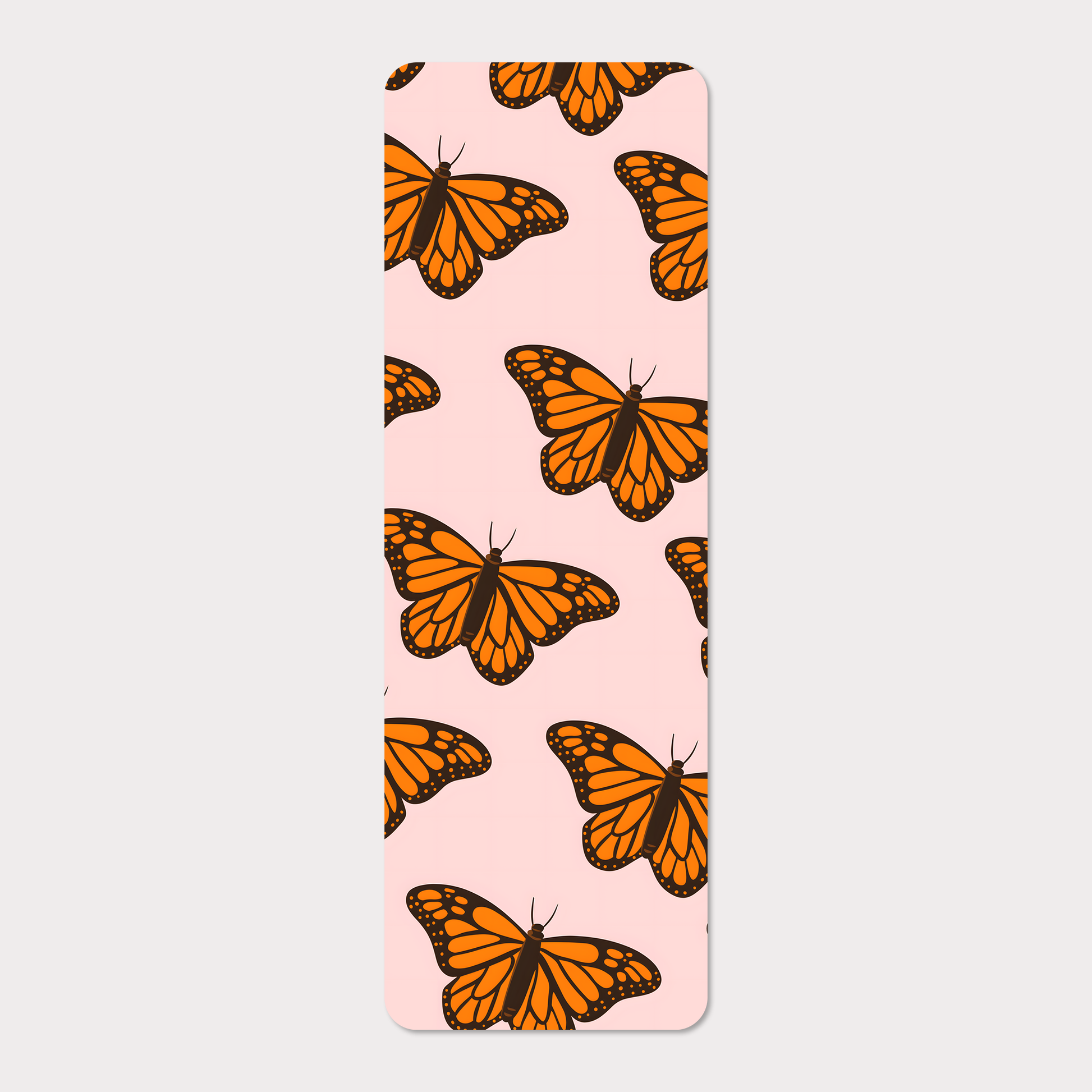 Fjärilsdans är ett bokmärke med ett elegant mönster av monarkfjärilar i orange och svart mot ljusrosa bakgrund. Varje fjäril ser ut att precis ha lyft – en hyllning till frihet, rörelse och naturens poesi. Ett bokmärke som sätter mjuk rörelse i varje sida du vänder.
