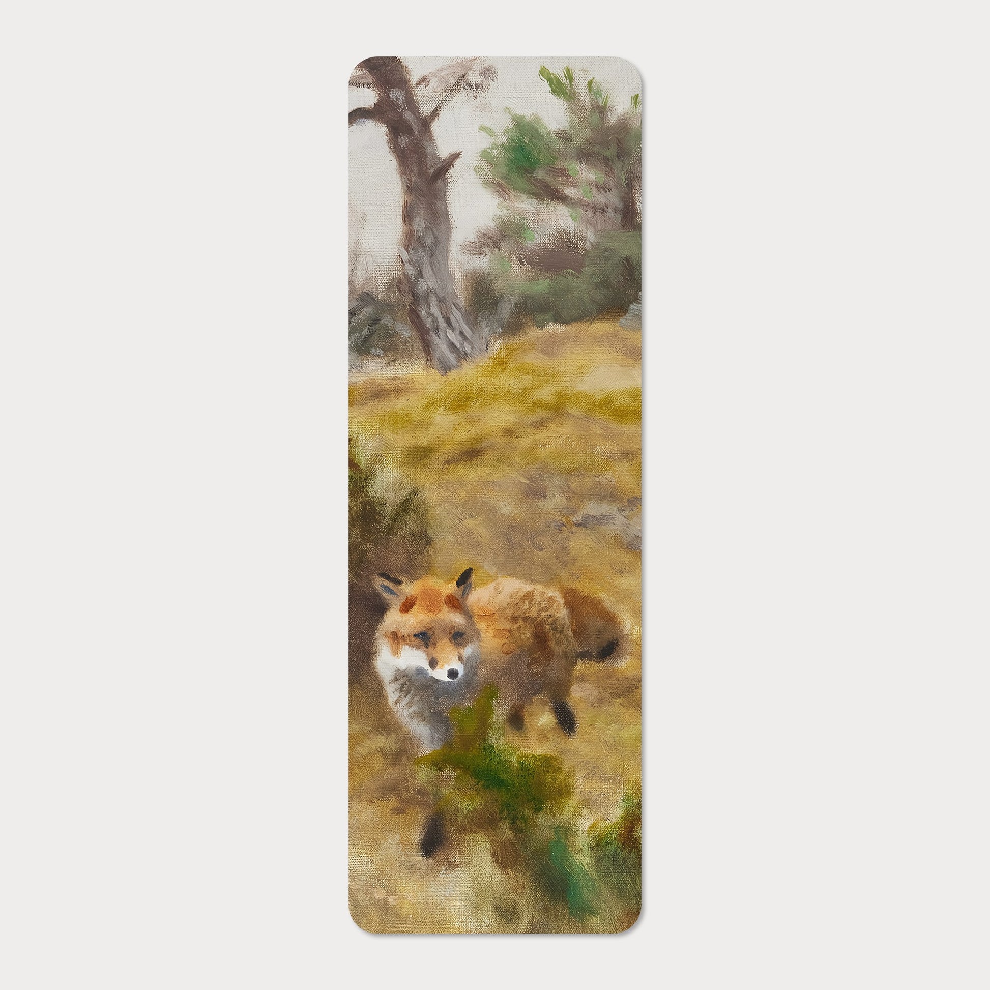 Räv i höstlandskap är ett bokmärke med motiv av Bruno Liljefors, där den röda räven rör sig genom ett naturtroget landskap i toner av brunt och bärnsten. Med konstnärens känsla för rörelse och stämning fångas ett ögonblick som doftar fuktig mossa och prasslande löv. Ett bokmärke som bär hösten mellan sidorna.