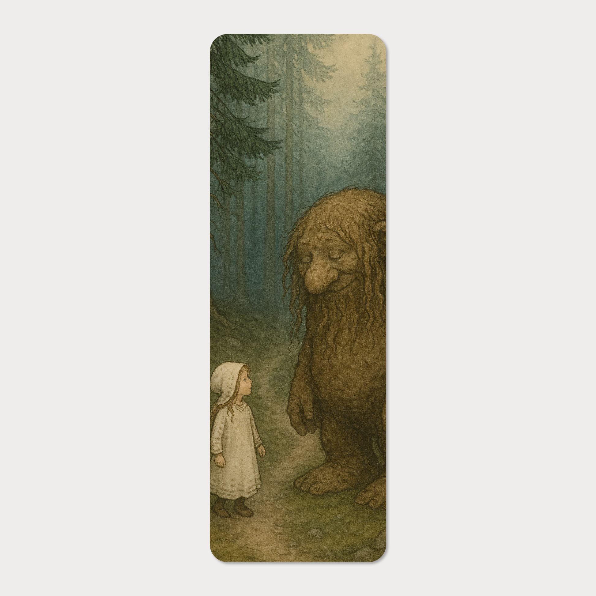 Skogens Väsen är ett bokmärke inspirerat av John Bauers magiska värld, där en liten flicka möter ett vänligt skogstroll mitt bland granar och mossa. Motivet fångar den nordiska sagoskogens stillhet, mystik och värme – ett konstnärligt bokmärke som gör varje lässtund lite mer magisk.
